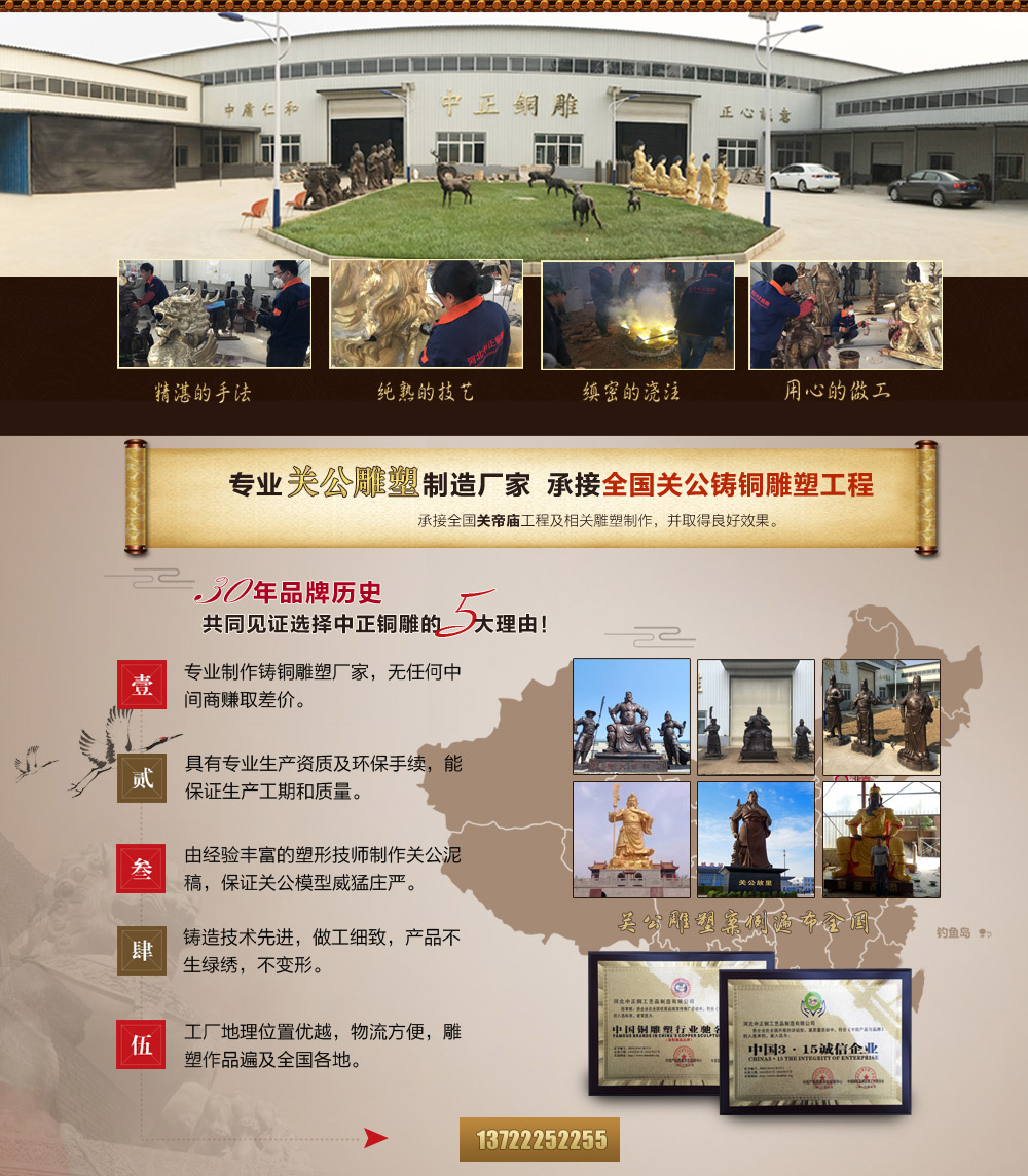 河北中正銅工藝品制造有限公司是一家具有獨(dú)立設(shè)計(jì)、雕塑、鑄造、制作施工能力的單位。擁有完善的,大型的,先進(jìn)的生產(chǎn)設(shè)備,并由多位經(jīng)驗(yàn)豐富的高級(jí)鑄造技師指導(dǎo)生產(chǎn)及制作。公司主要鑄造銅關(guān)公,九龍銅關(guān)公,福建銅關(guān)公,臺(tái)灣銅關(guān)公,關(guān)羽雕塑,鑄銅關(guān)公,銅雕關(guān)公,1米銅關(guān)公,2米銅關(guān)公等,可按客戶(hù)提供動(dòng)物銅雕圖片訂做加工銅關(guān)公,九龍銅關(guān)公,做工精美,質(zhì)量保證。